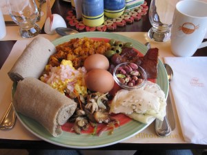 March 10, 2010Just reaching the end of the second day of Ethiopian travel/cuisine. I am really impressed with both so far. The people are truly wonderful. It’s great to be in a country where people are smiling. I have finished the visa gathering process for Somaliland (it was really easy actually – 11 minutes/$40 to be exact). After reviewing the itinerary, the plan has changed slightly. The plan is to go to Somaliland via the Jubba Airways flight and to hire a land cruiser to drive back to Addis. From Addis, there will be a little extra time, so a detour to Yemen is needed. I’ll be flying into Sana’a on the morning of the 17th, and returning on the evening of the 19th. The Yemeni visa situation (which is quite a pain) was taken care of today and I will pick my passport tomorrow. This leaves one more day of soaking up everything Addis has to offer and catching my flight to Djibouti City the day after tomorrow. One thing that I didn’t realize, Ethiopians fast for a little over a month prior to Easter. It’s sort of like a Christian version of Ramadan, however they can only eat vegetables instead of waiting for sundown. The vegetable dishes have been amazing though. Pictures to follow for sure, but take my word for it, they are like nothing you have ever seen! A helpful phrase in Amharic for the gluten free travelers: Sende na besso yamenyal. Meblat alchelem (Wheat and Barley – I can’t eat. It makes me sick).